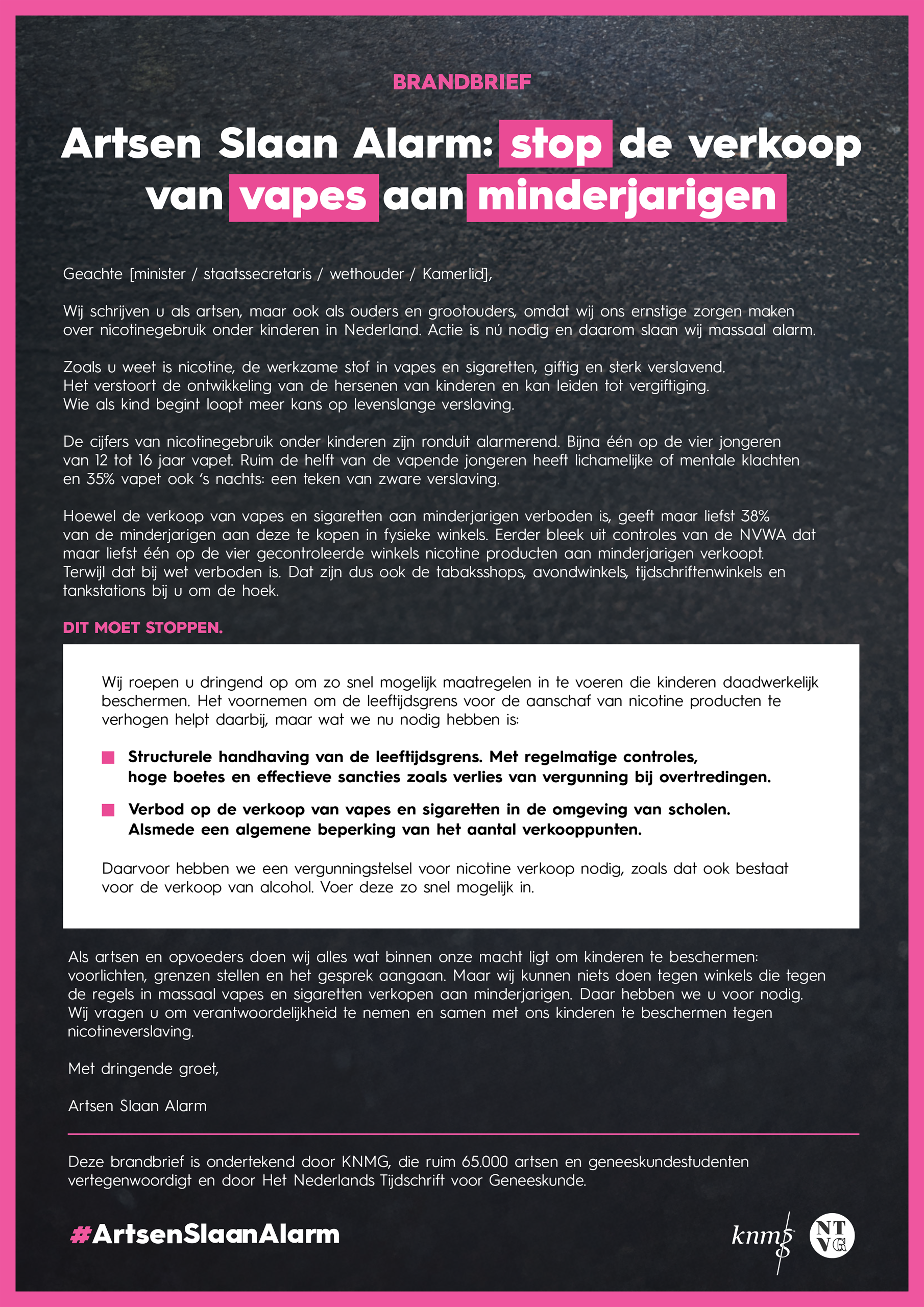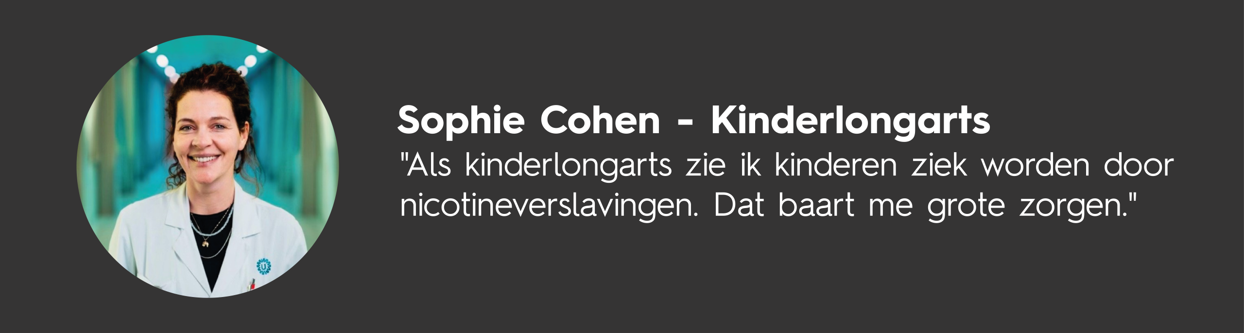 Nicotine verstoort de hersenontwikkeling bij jongeren en kan hen later vatbaarder maken voor andere verslavingen. Op korte termijn vergroot vapen de kans op psychische klachten en longproblemen, maar ook verlies van fitheid, hoesten, ernstiger astma of een longontsteking. Veel onderzoek laat nu al zien dat vapen op de lange termijn kan leiden tot kanker, ernstige schade aan de longen en hart- en vaatziekten. Zestig procent van de jongeren ervaart één of meer lichamelijke en of psychische klachten door nicotinegebruik. Cijfers van de Nederlandse Vereniging voor Kindergeneeskunde laten zien dat in 2024 zeker 14 kinderen na het vapen in het ziekenhuis zijn beland met ernstige aandoeningen zoals een klaplong of een longbloeding.