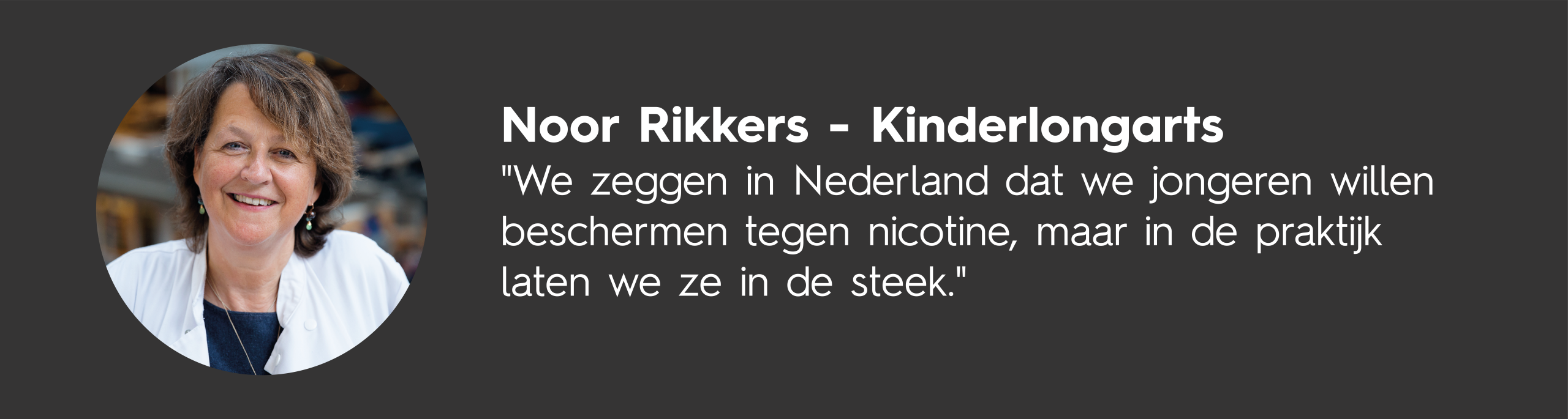In 2023 had 24,6% van de Nederlandse jongeren van 12 tot 16 jaar ooit een vape gebruikt (Trimbos cijfers 2023). Uit recent vragenlijstonderzoek onder 978 Nederlandse scholieren (minderjarigen) (maart-mei 2025) kwam naar voren dat de gemiddelde startleeftijd voor nicotinegebruik 12,8 jaar is. Van de jongeren die maandelijks een e-sigaret gebruiken, rookt 69,1% ook maandelijks sigaretten en gebruikte 70% het afgelopen jaar zowel vapes als sigaretten. Daarnaast wordt 35% van de jongeren met een nicotineverslaving ’s nachts wakker om te vapen.